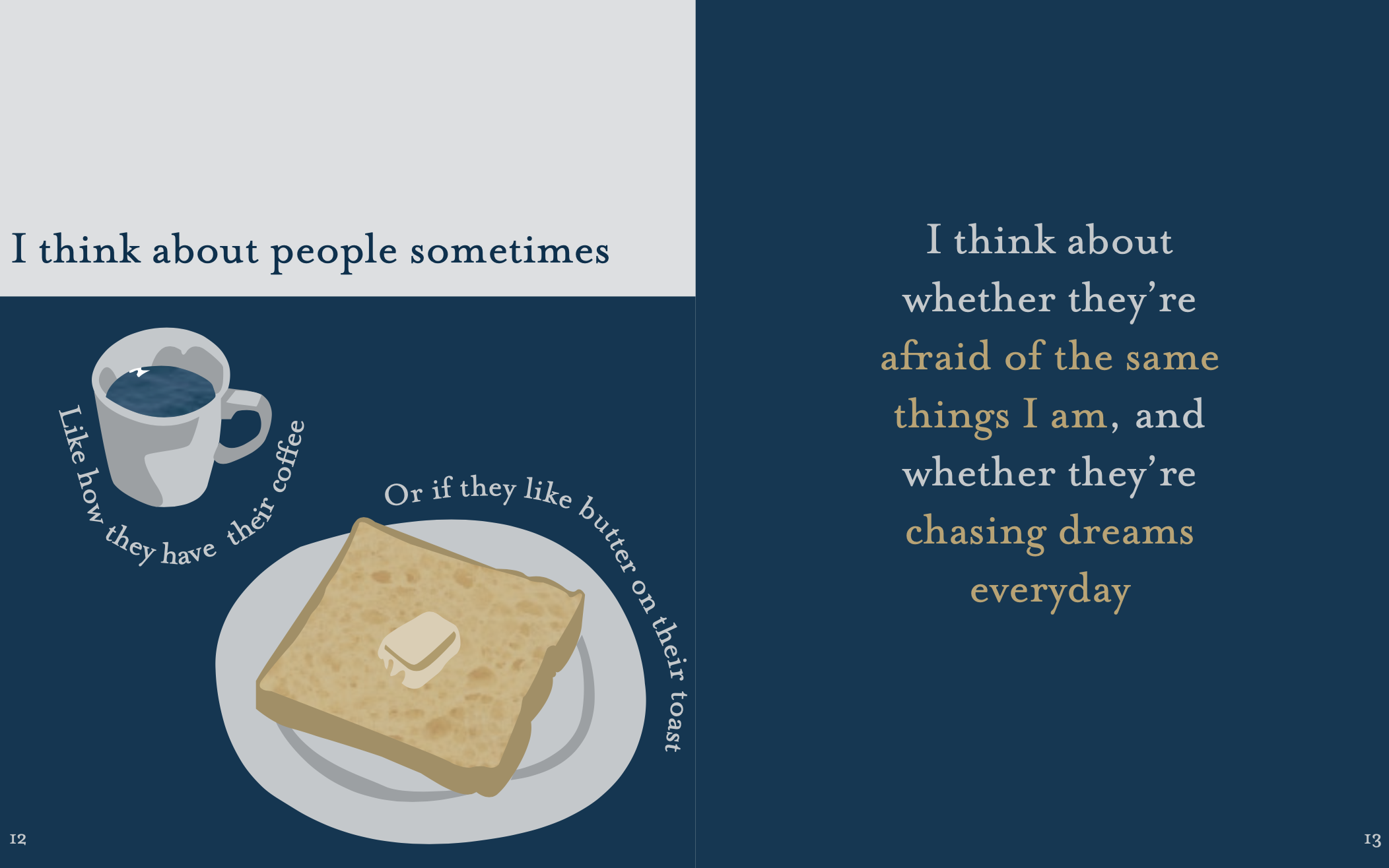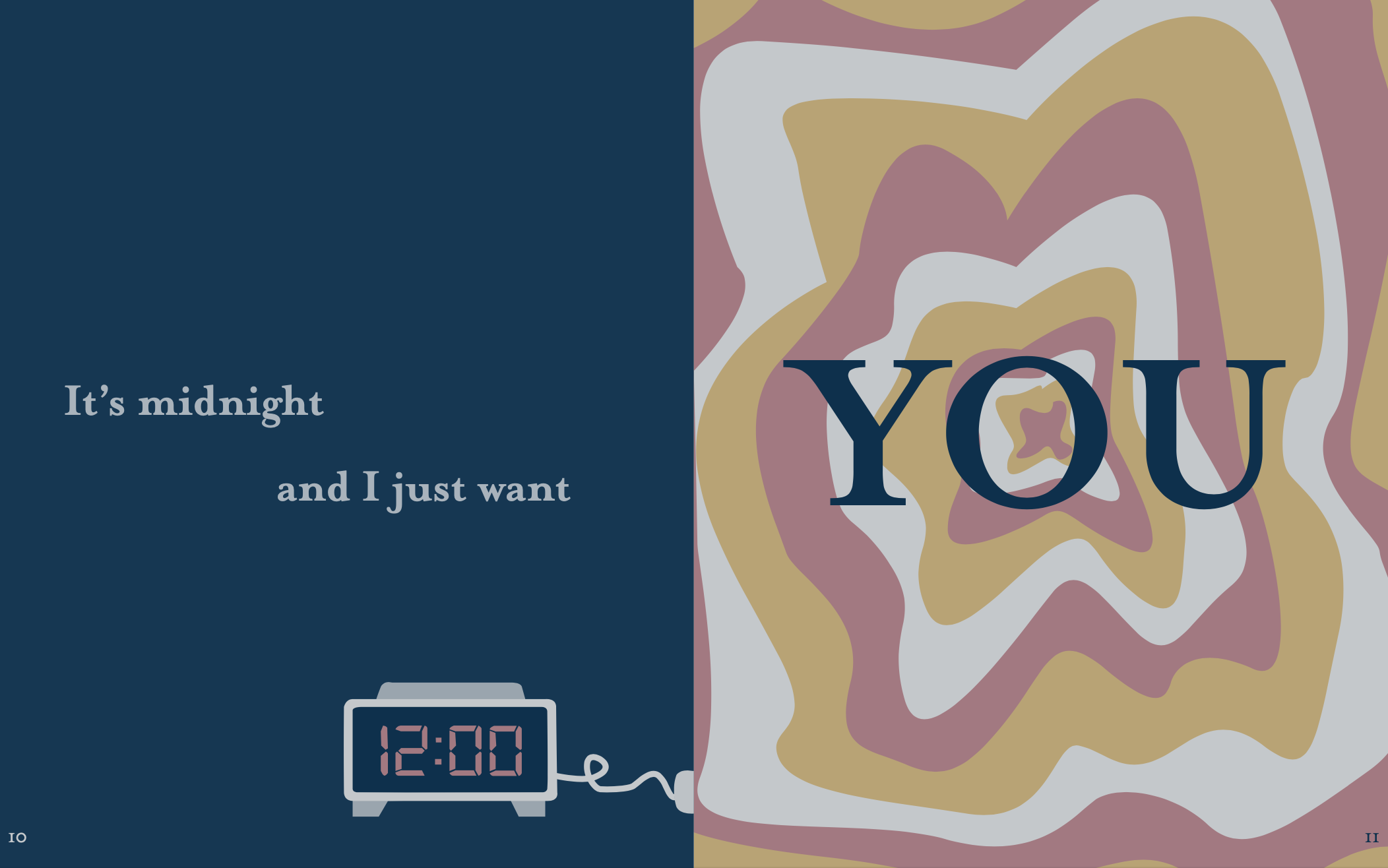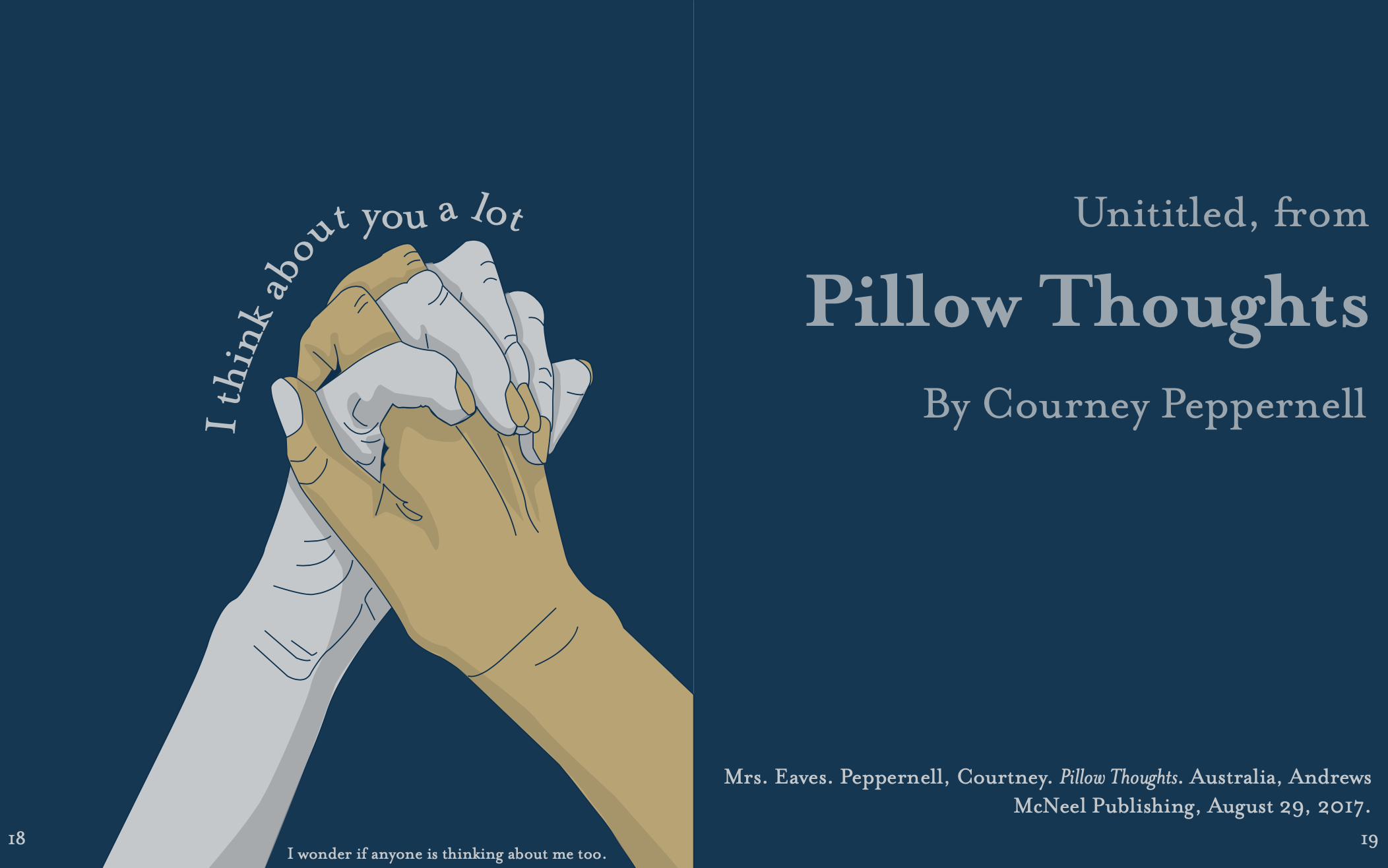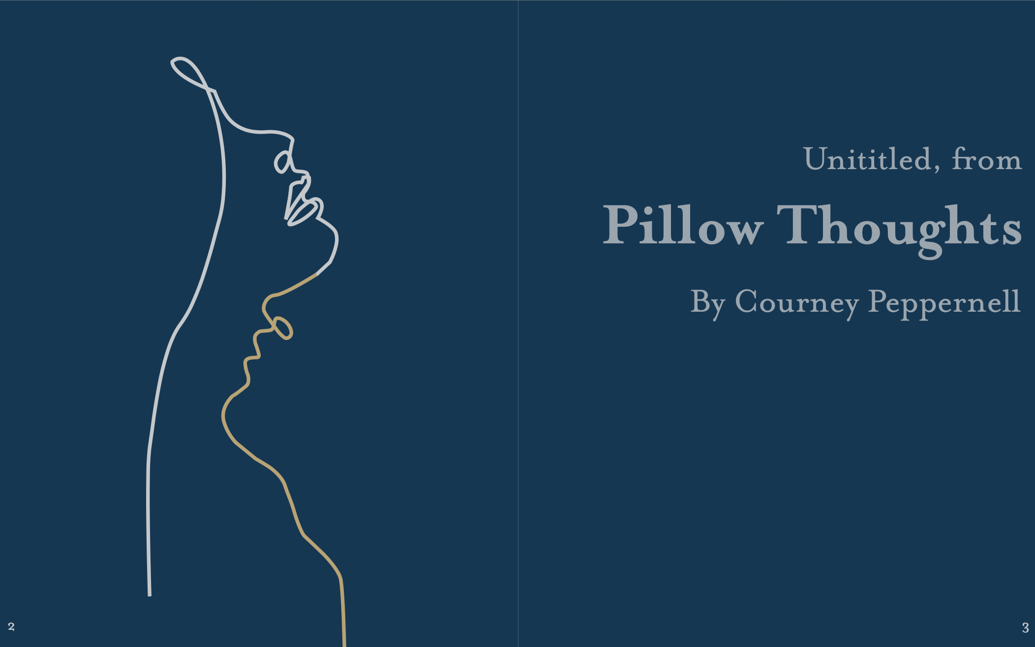 In this project, we had to take a piece of poetry or literature that we loved and turn it into visualized typography. I chose to use excerpts from the poetry anthology Pillow Thoughts by Courtney Peppernell. Made for print booklet, 2021